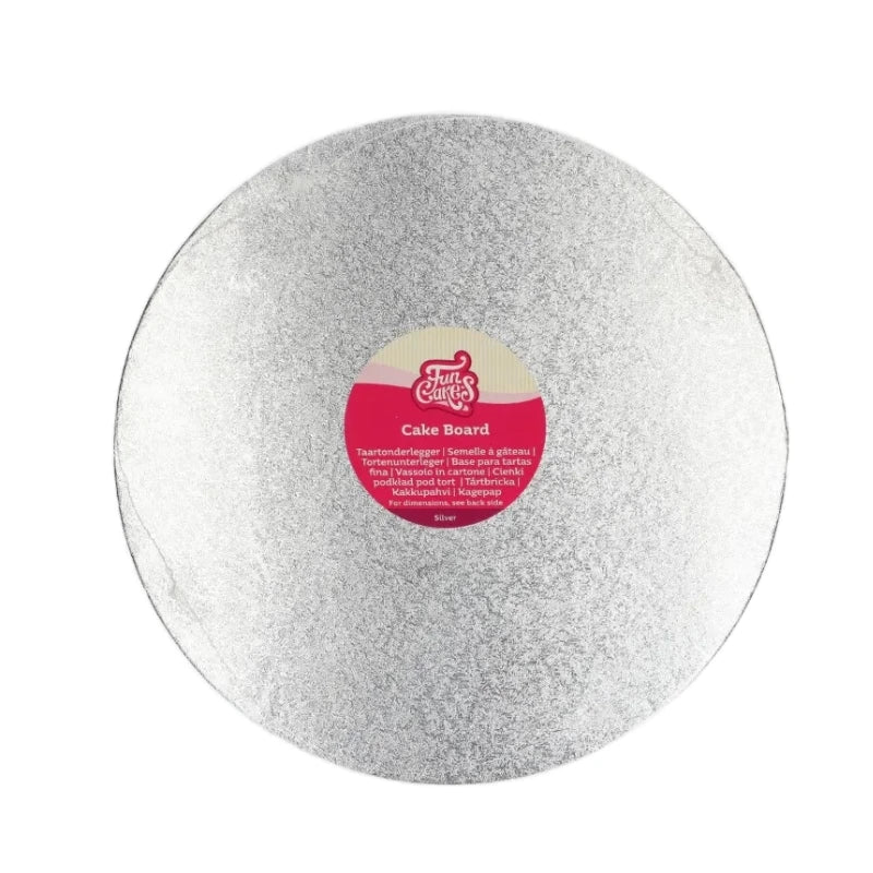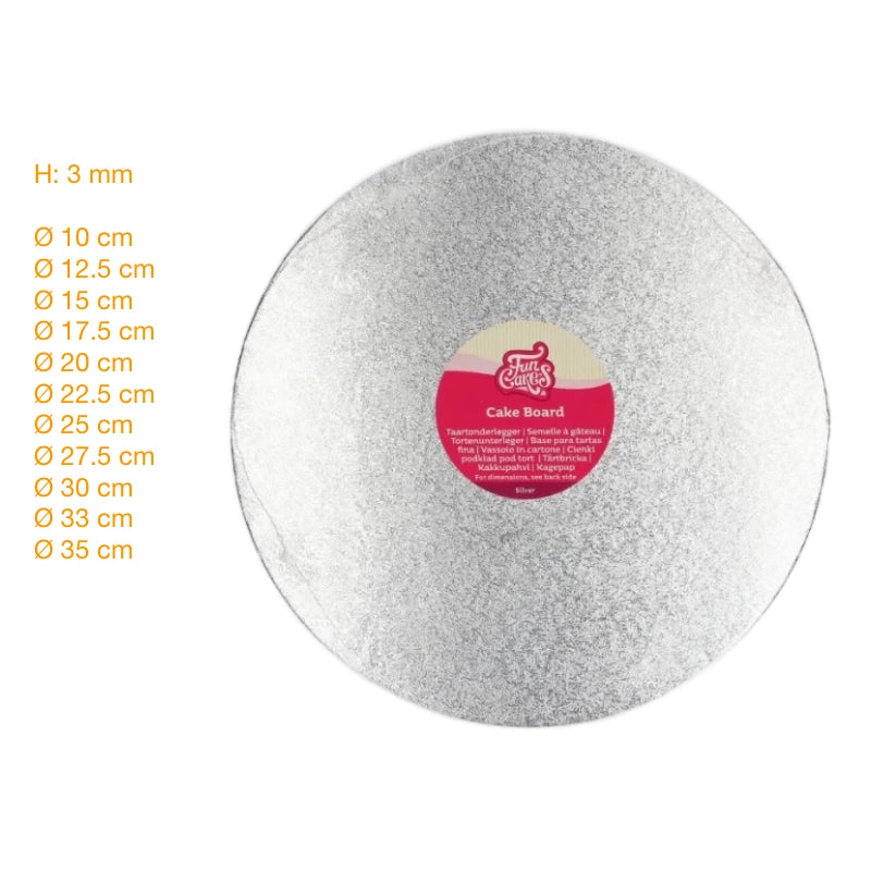 Ein rundes Brett von hoher Qualität und mit luxuriöser Optik. Das Board ist in verschiedenen Durchmessern erhältlich: 10; 12,5 ; 15 ; 17,5 ; 20 ; 22,5 ; 25 ; 27,5 ; 30 ; 33 und 35 cm. Es ist 3 mm dick. Er kann als dekorativer Kuchenteller dienen und wiederverwendet werden.