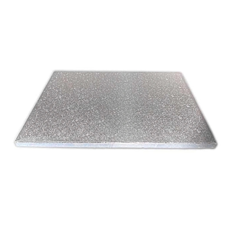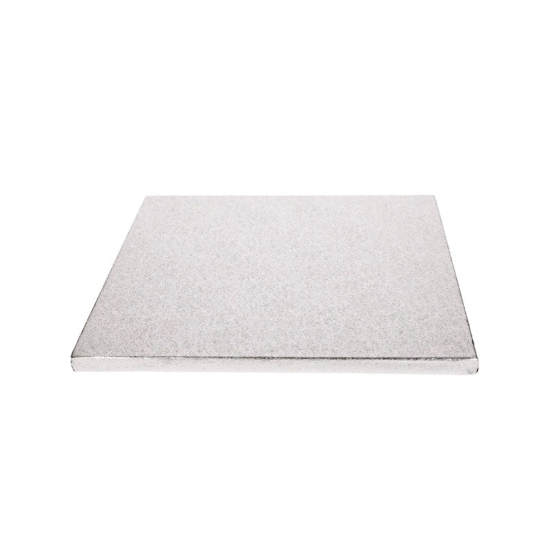 Quadratische Kuchentrommel aus Silberfolie mit gedrehtem Rand, erhältlich in verschiedenen Größen.