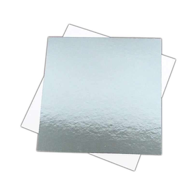 Silber-weißes, quadratisches Kuchenbrett mit geschnittenen Kanten und weißer Poly-Rückseite. Dieses Produkt kann als wendbares silbernes und weißes Kuchenbrett verwendet werden. Größe: 30 cm x 30 cm. Dicke: 1,5 mm.