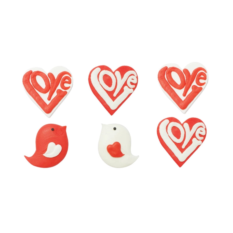 Pack de 4 coeurs en forme de coeur et 2 tourtereaux.Décorations comestibles en sucre Decora Love Love, 6 pièces