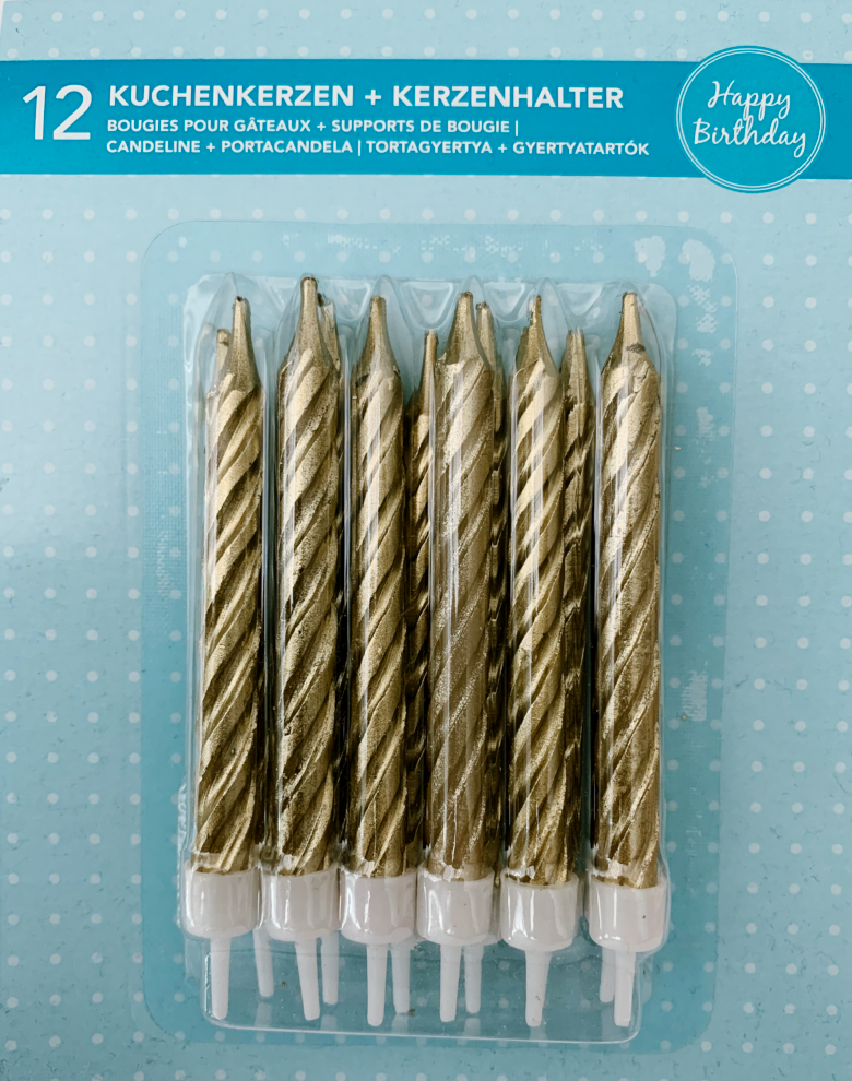Bougies dorées pour gâteaux avec supports pour décorer votre gâteau ou cupcakes. Couleur - or. Contenu - 12 bougies avec supports. Hauteur de la bougie - environ 8 cm.
