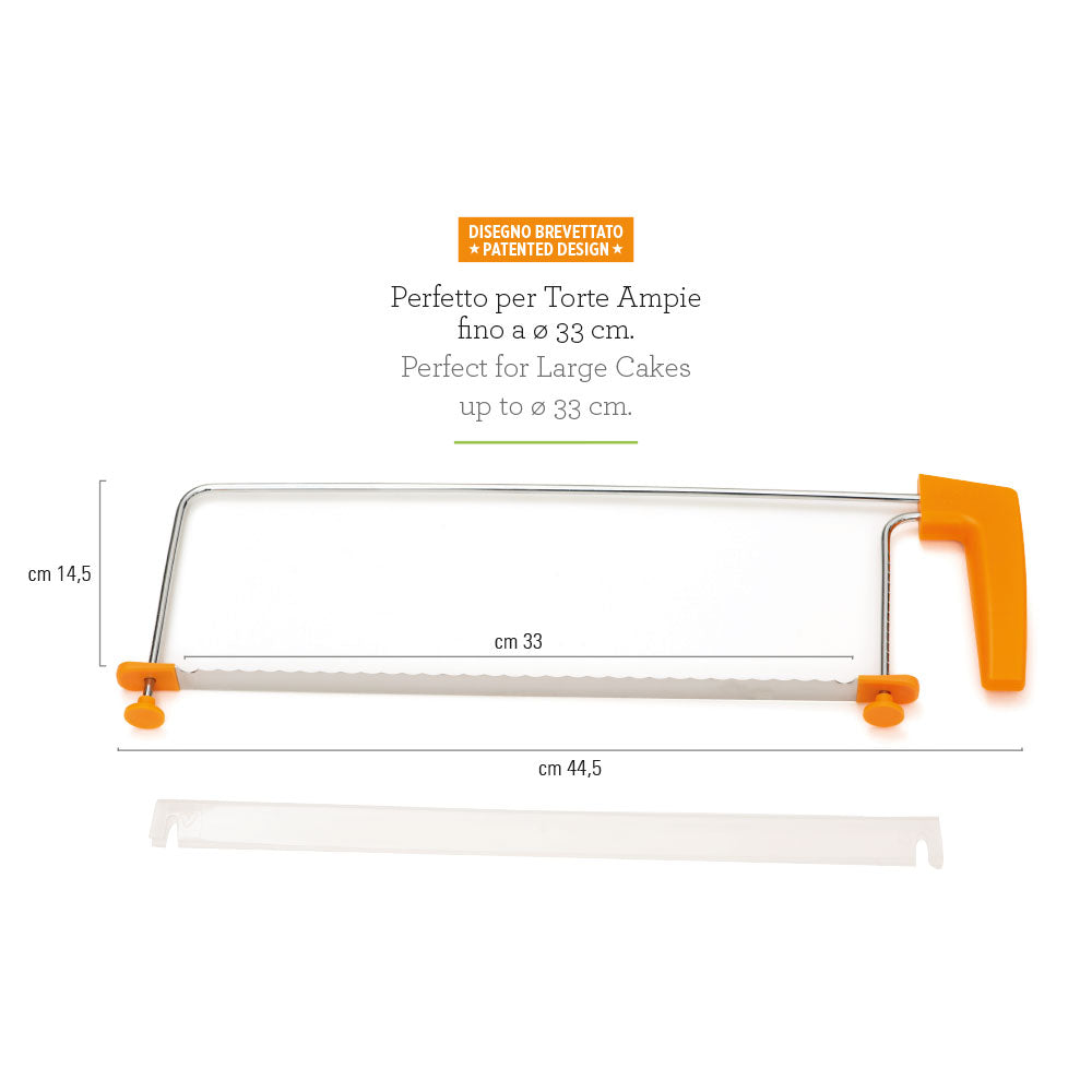 Convenient Cake Splitter tool to easily slice cakes into layers evenly and evenly. Equipped with an innovative stainless steel blade, serrated and sharpened, to obtain greater precision in cutting. With clear plastic blade protector coating for added safety during storage. Thanks to the side notches, the blade can be adjusted to 14 different heights. The plastic handle with comfortable grip and ergonomic shape, allows a firmer, more comfortable and safe grip ensuring a precise and regular cut.