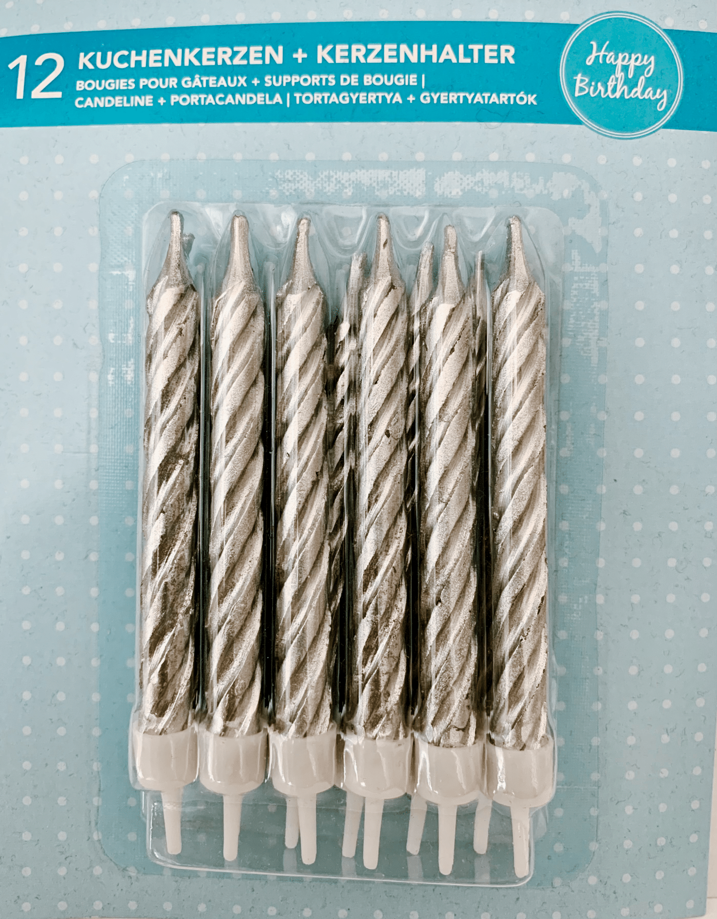 Bougies argentées gâteaux avec supports pour décorer votre gâteau ou cupcakes. Couleur - or. Contenu - 12 bougies avec supports. Hauteur de la bougie - environ 8 cm.