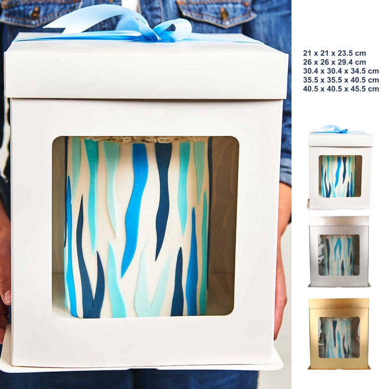 Effortlessly transport and present large, beautifully decorated cakes with FunCakes' elegant and stylish Tall Cake Box. Its strong, thickened base plate and 4 built-in indents ensure stability and prevent ribbon slipping. Easy assembly with hook and loop strips, allowing for multiple uses. Available in white, gold, and silver. Simply select a size and a colour that suits best for your cake.