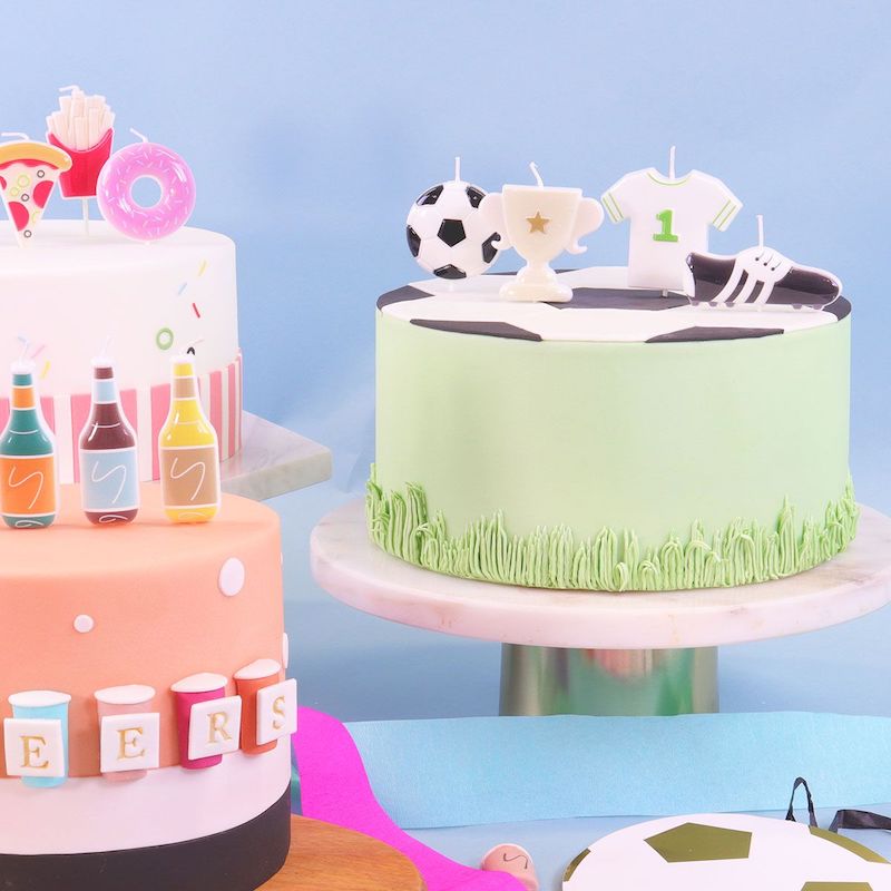 A set of colourful candles in a shape of t-shirt, ball, boot and football. These cake candles are perfect addition to any party. Decorate your cakes or cupcakes with these fun PME Football candles!